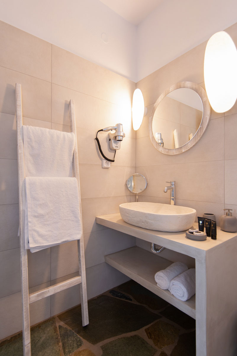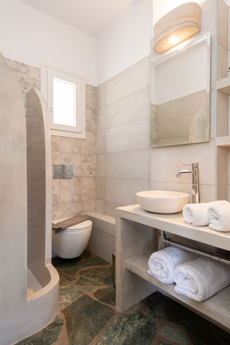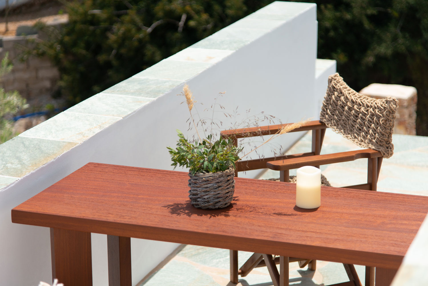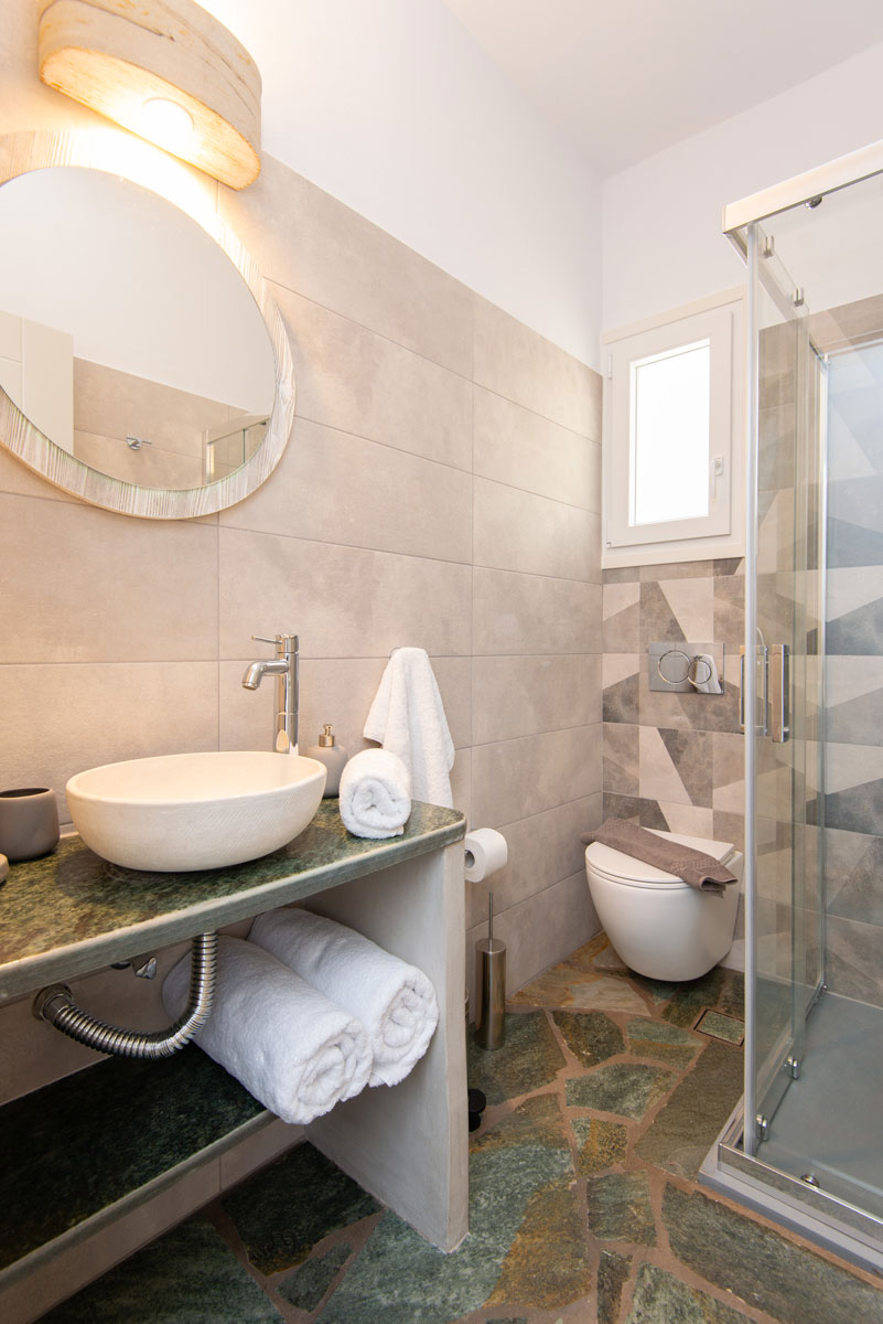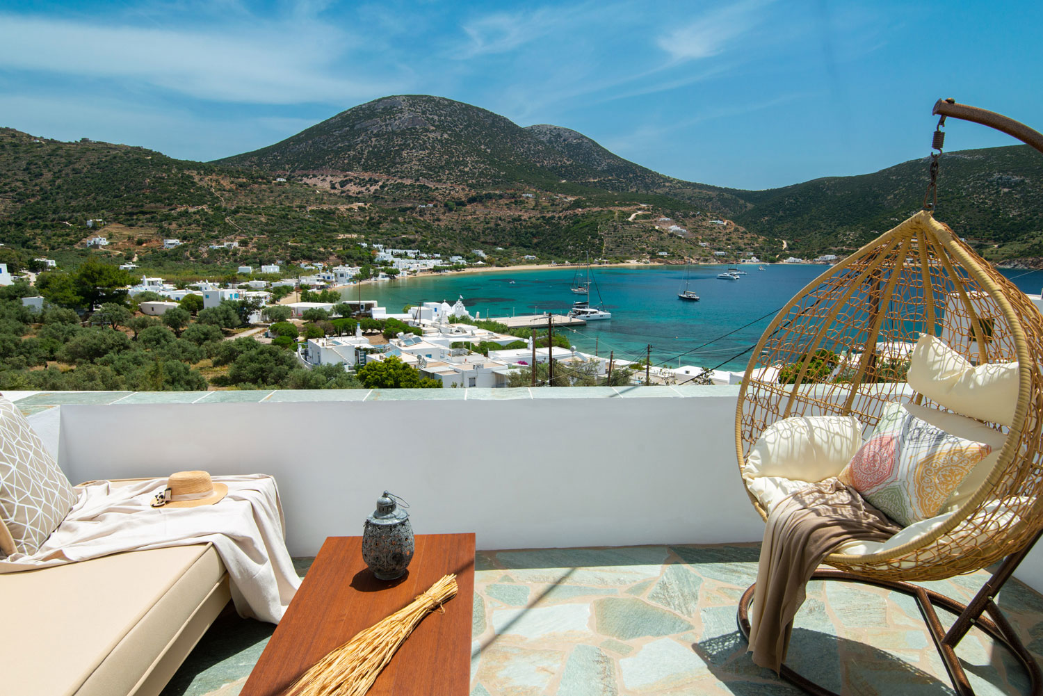 Όλα τα διαμερίσματα διαθέτουν πλακόστρωτες ιδιωτικές βεράντες με άνετα καθιστικά και απεριόριστη θέα στη θάλασσα και στον γραφικό κόλπο του Βαθιού.
