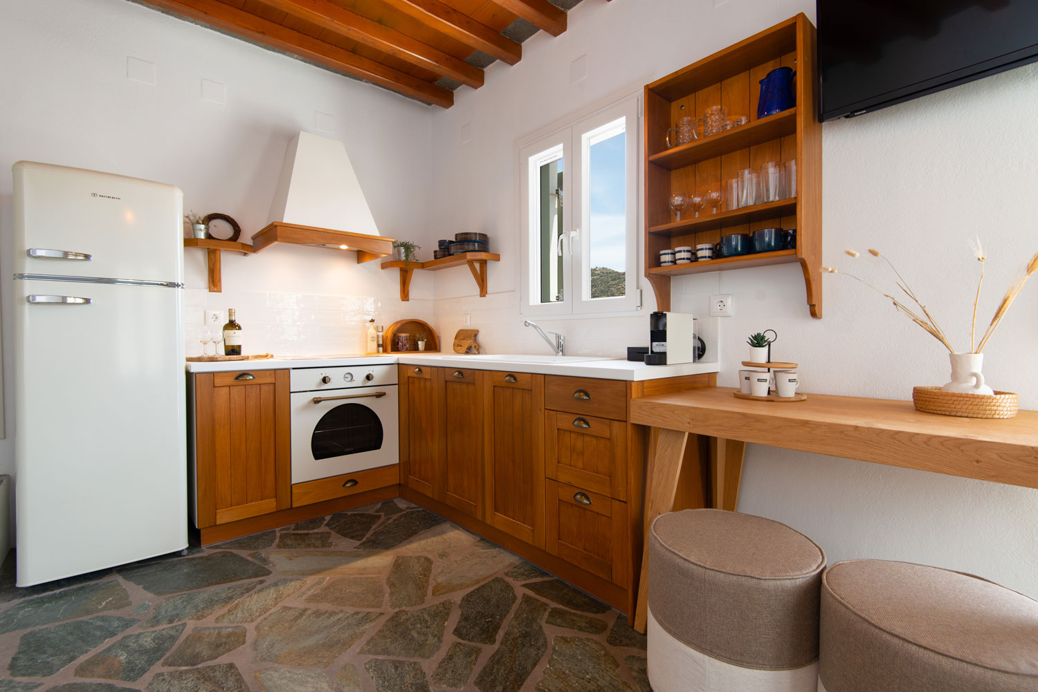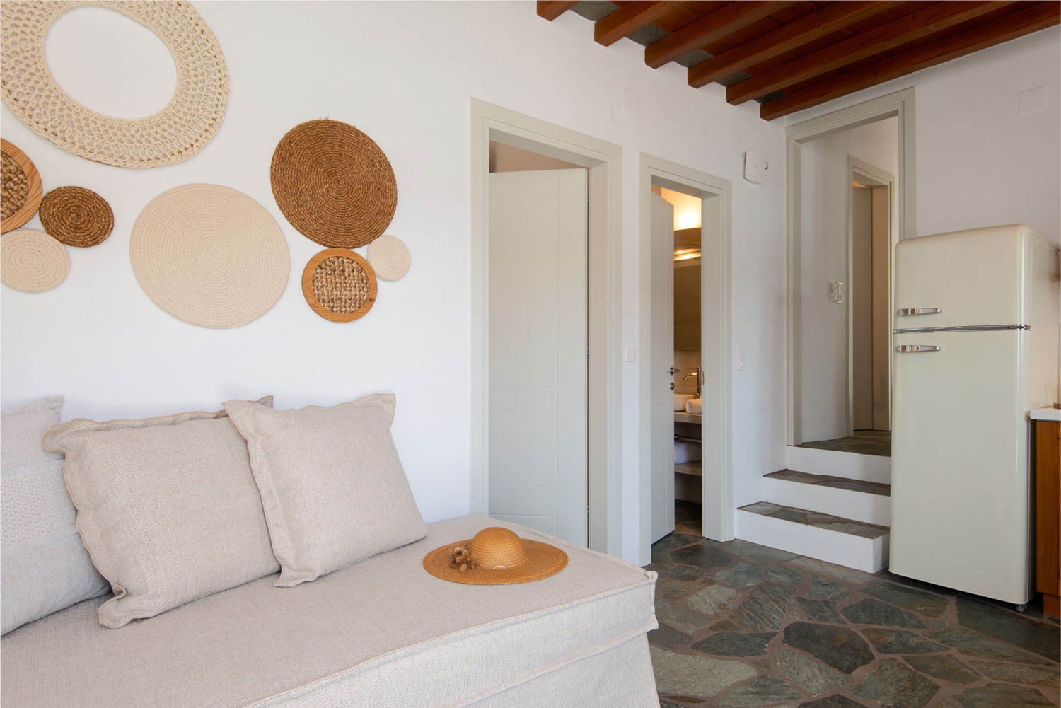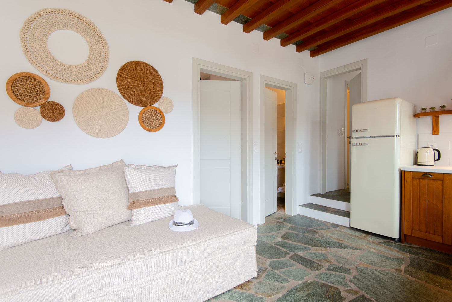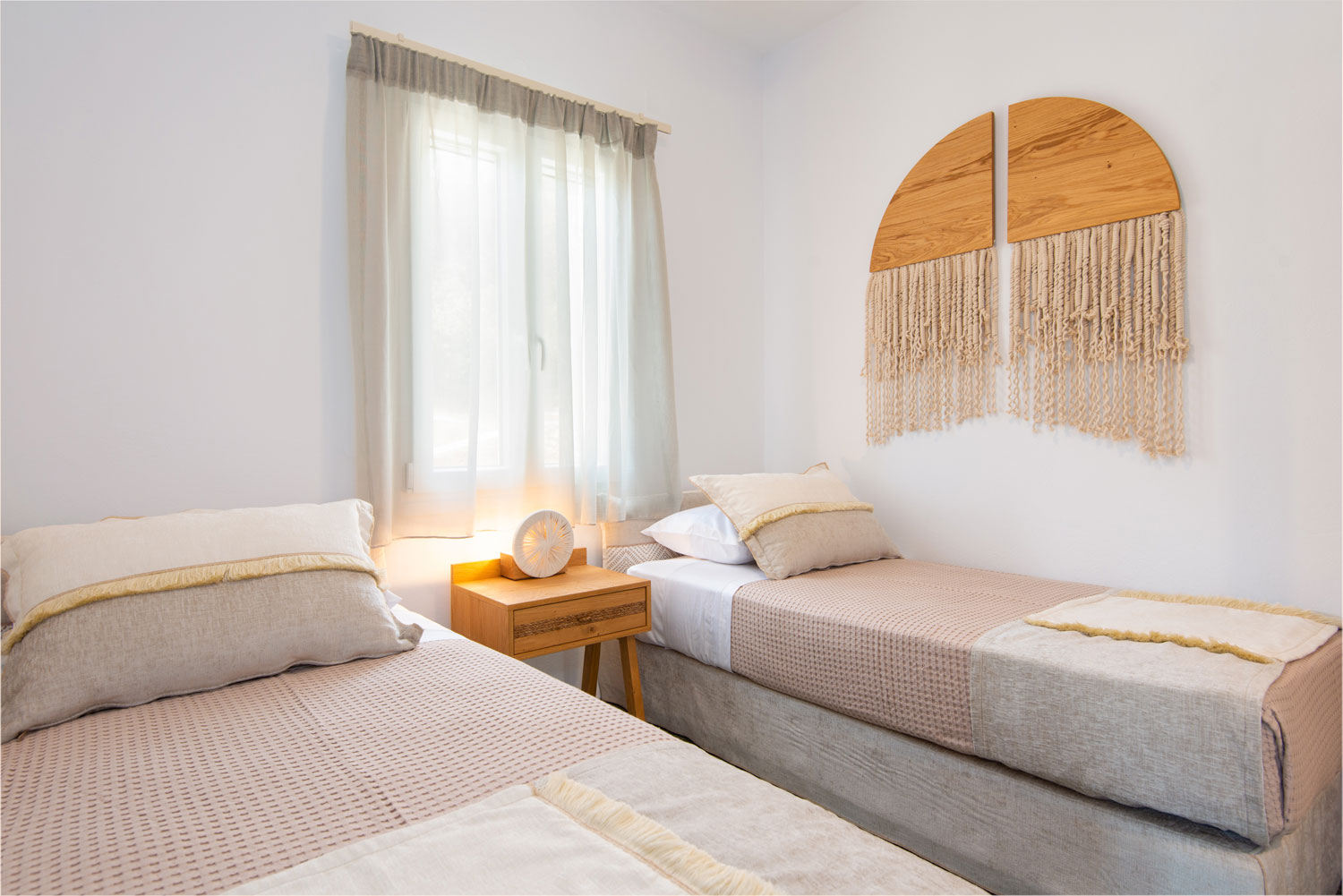 Οι ξύλινες λεπτομέρειες, τα πλακόστρωτα δάπεδα, τα παραδοσιακά ταβάνια με τα ξύλινα δοκάρια συνδυάζονται με απόλυτη αρμονία με τις σύγχρονες απαιτήσεις και ανάγκες στα τρίχωρα διαμερίσματα. Διαθέτουν δύο ευρύχωρα υπνοδωμάτια -το ένα με διπλό κρεβάτι και το άλλο με δύο μονά - τα οποία είναι εξοπλισμένα με κλιματισμό, ανεμιστήρα οροφής και τηλεόραση. Στον τρίτο χώρο βρίσκεται η μοντέρνα κουζίνα που είναι πλήρως εξοπλισμένη με όλες τις απαραίτητες συσκευές ώστε να μπορείτε να παρασκευάσετε τις λιχουδιές σας. Στο χώρο της κουζίνας βρίσκεται και το καθιστικό με τραπέζι φαγητούι. Στα μπάνια συνδυάζονται τα μοντέρνα είδη υγιεινής και τα ξύλινα στοιχεία.