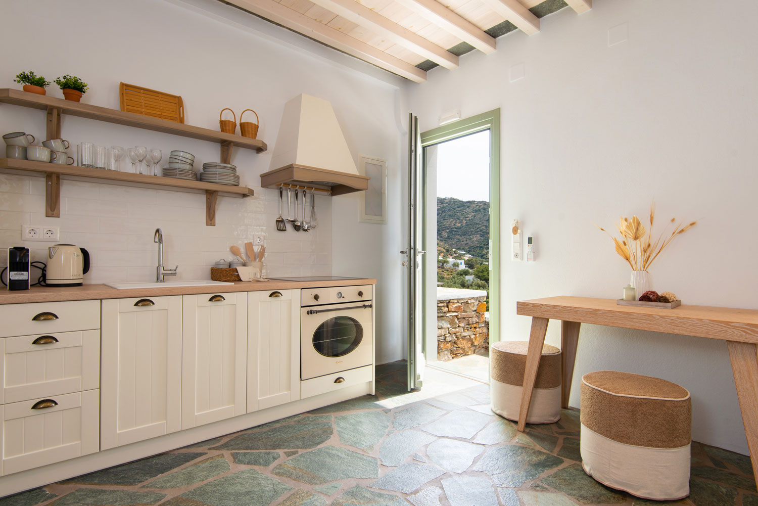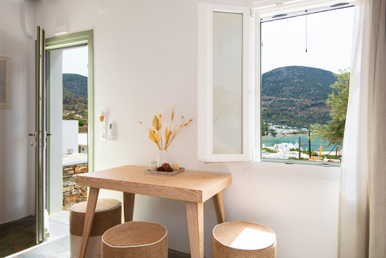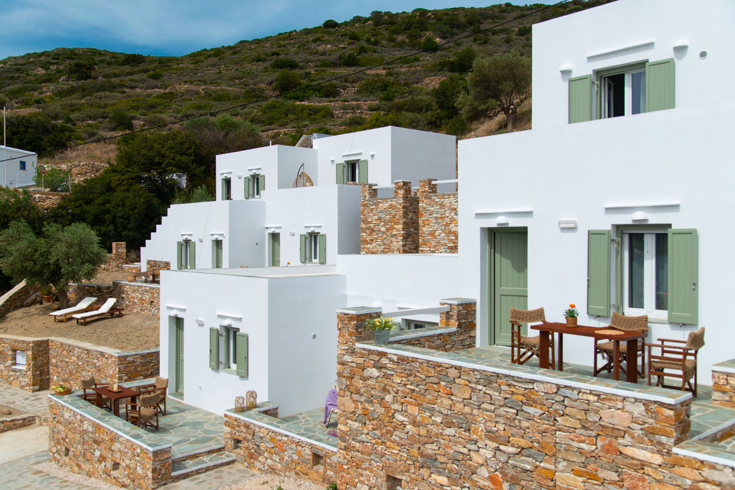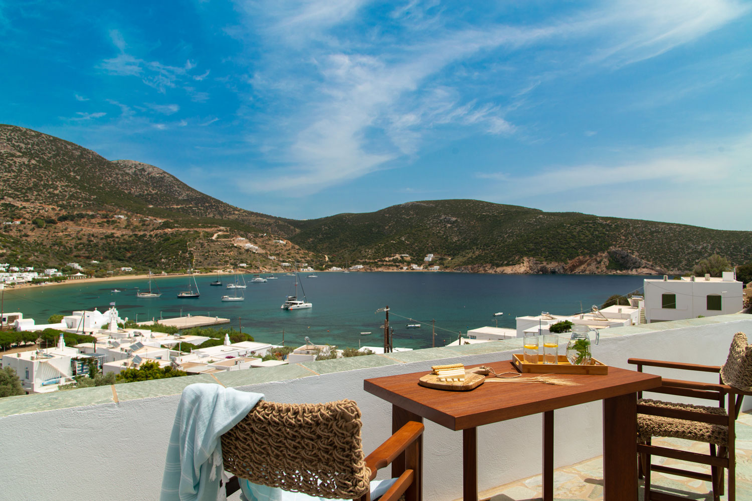 Όλα τα διαμερίσματα διαθέτουν πλακόστρωτες ιδιωτικές βεράντες με άνετα καθιστικά και απεριόριστη θέα στη θάλασσα, στον γραφικό κόλπο του Βαθιού αλλά και στο ηλιοβασίλεμα.