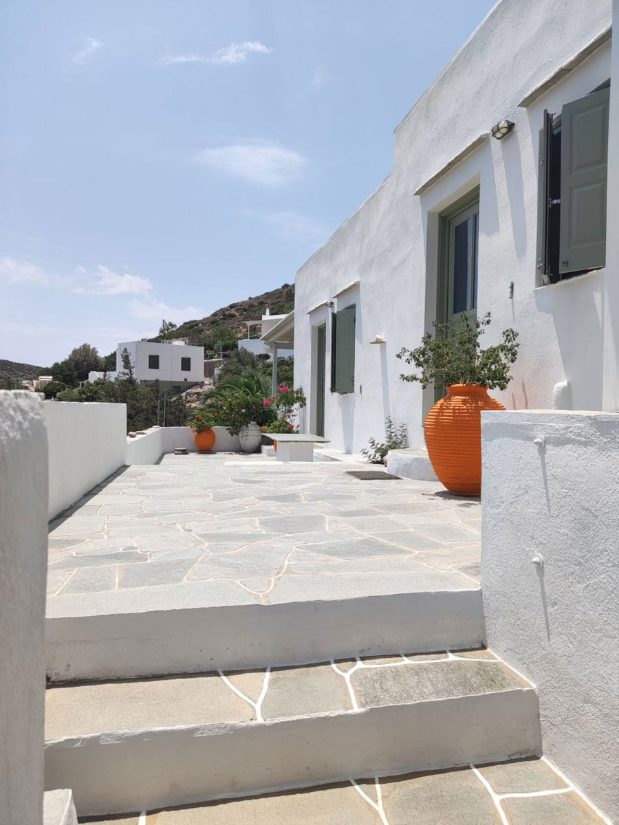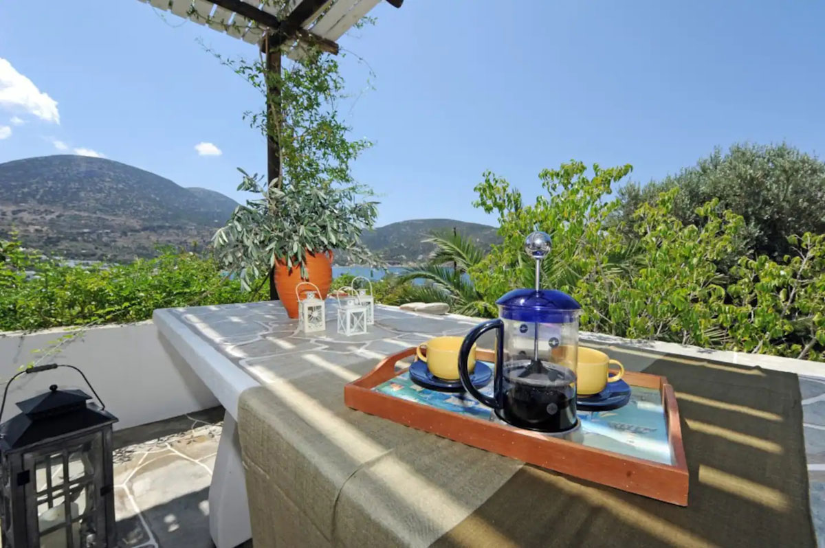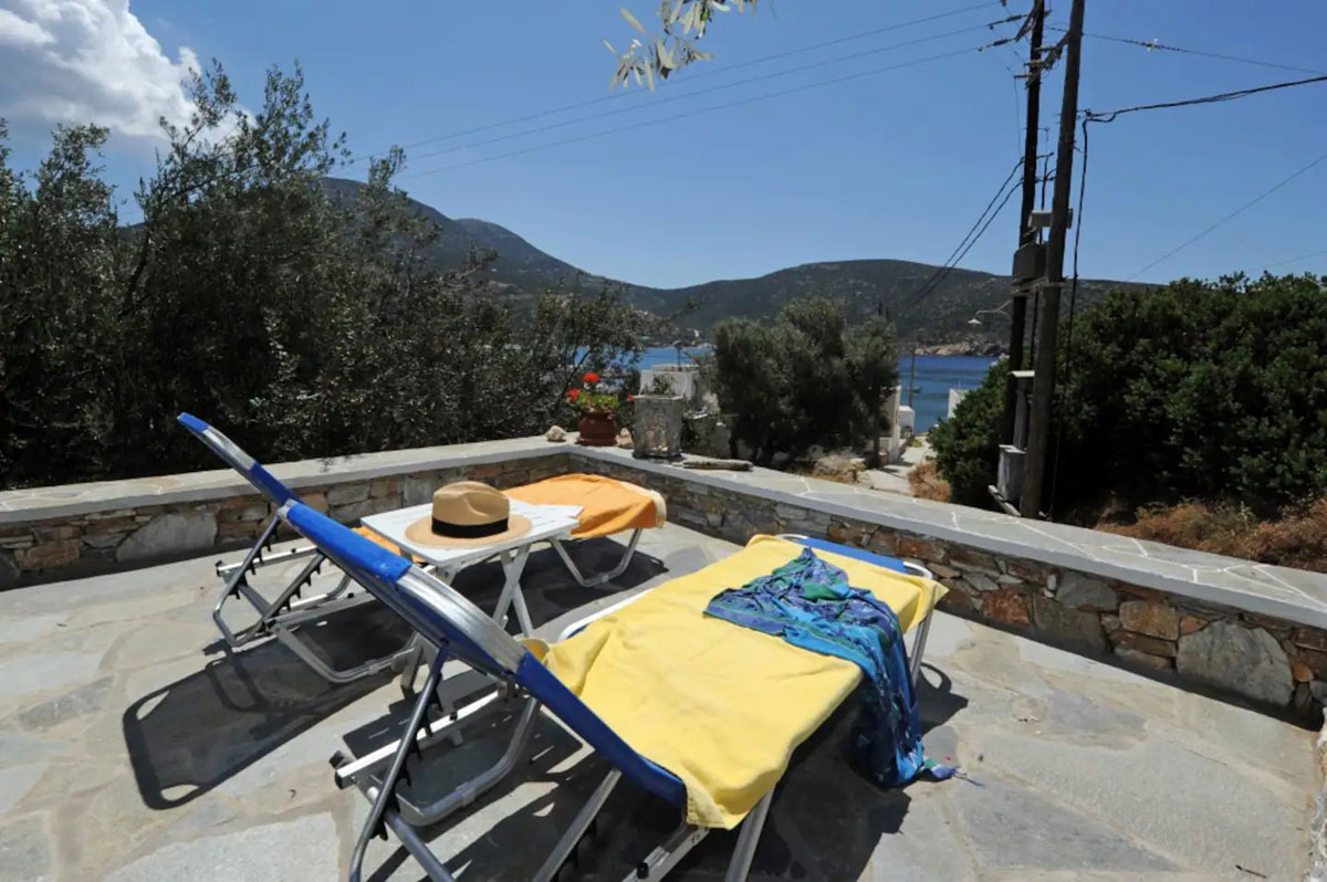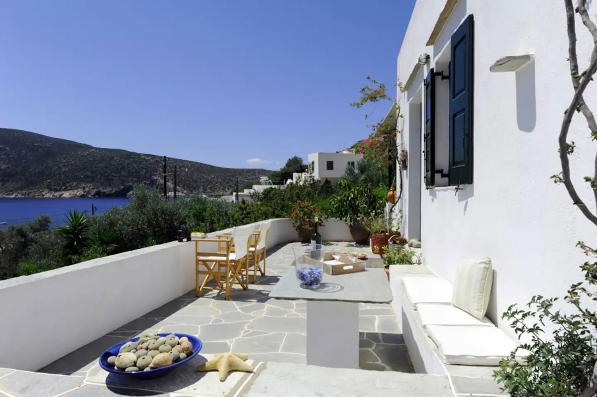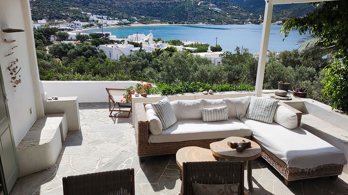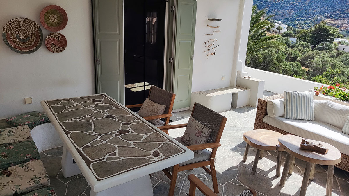 Περιμετρικά του σπιτιού υπάρχουν ευρύχωρες πλακόστρωτες αυλές με άνετα καθιστικά και σκιερές γωνίες από όπου μπορείτε να απολαύσετε τη θέα στον γραφικό κόλπο του Βαθιού.