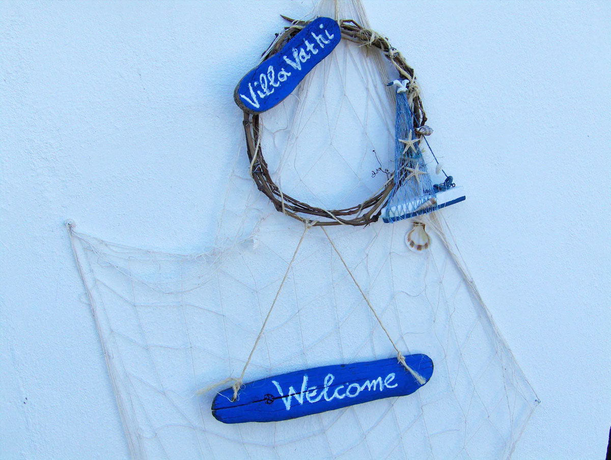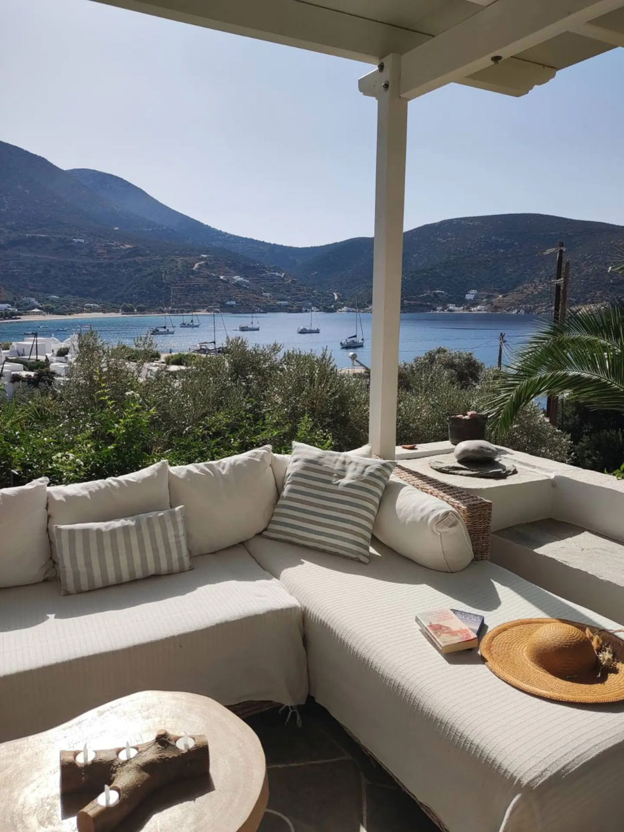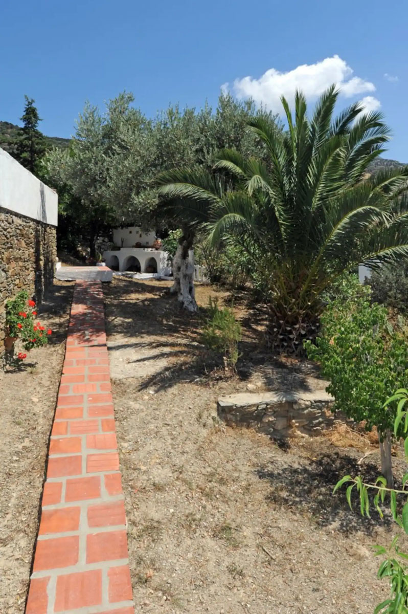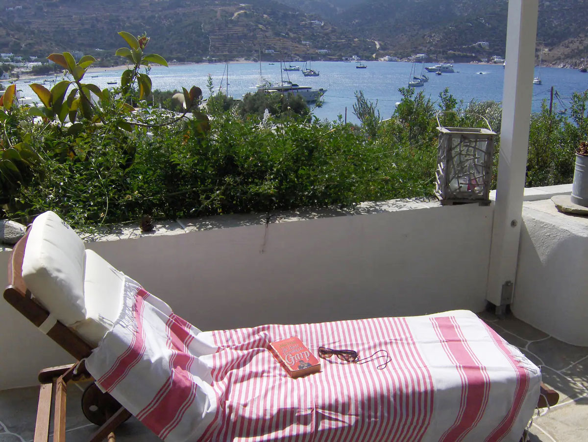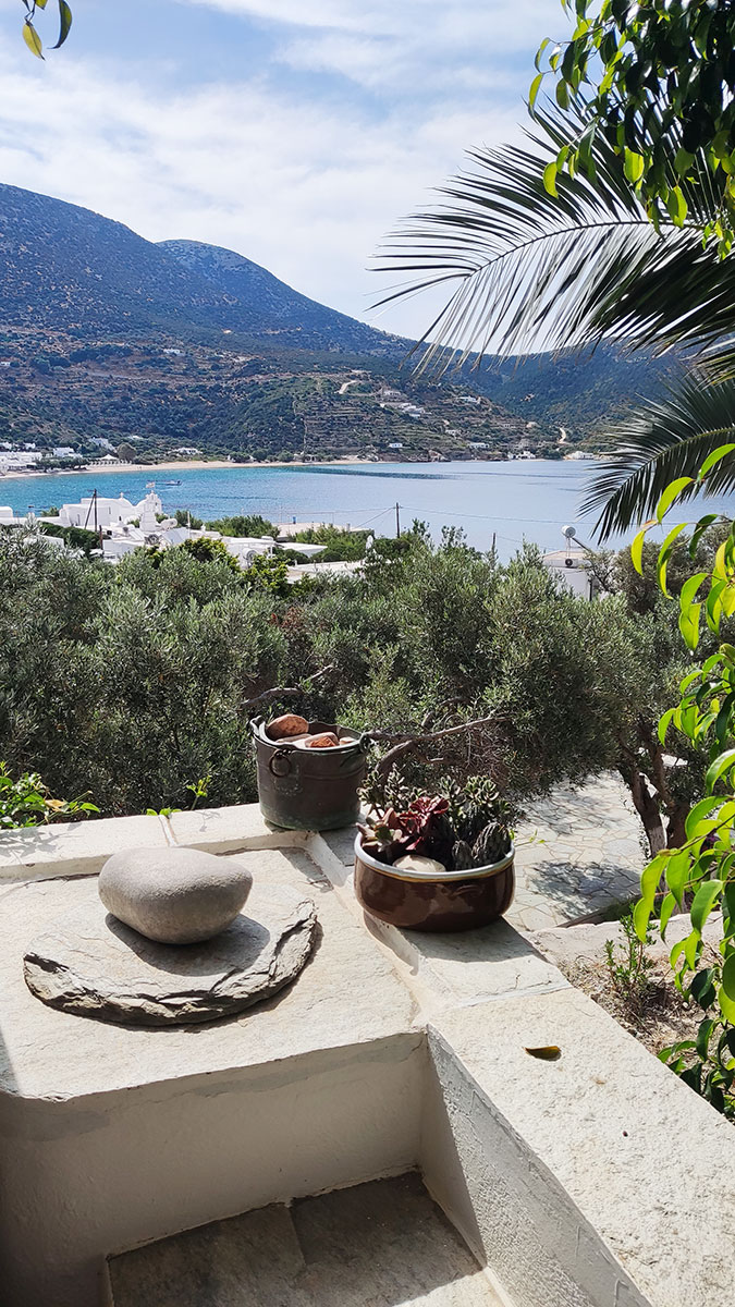 Περιμετρικά του σπιτιού υπάρχουν ευρύχωρες πλακόστρωτες αυλές με άνετα καθιστικά και σκιερές γωνίες από όπου μπορείτε να απολαύσετε τη θέα στον γραφικό κόλπο του Βαθιού.