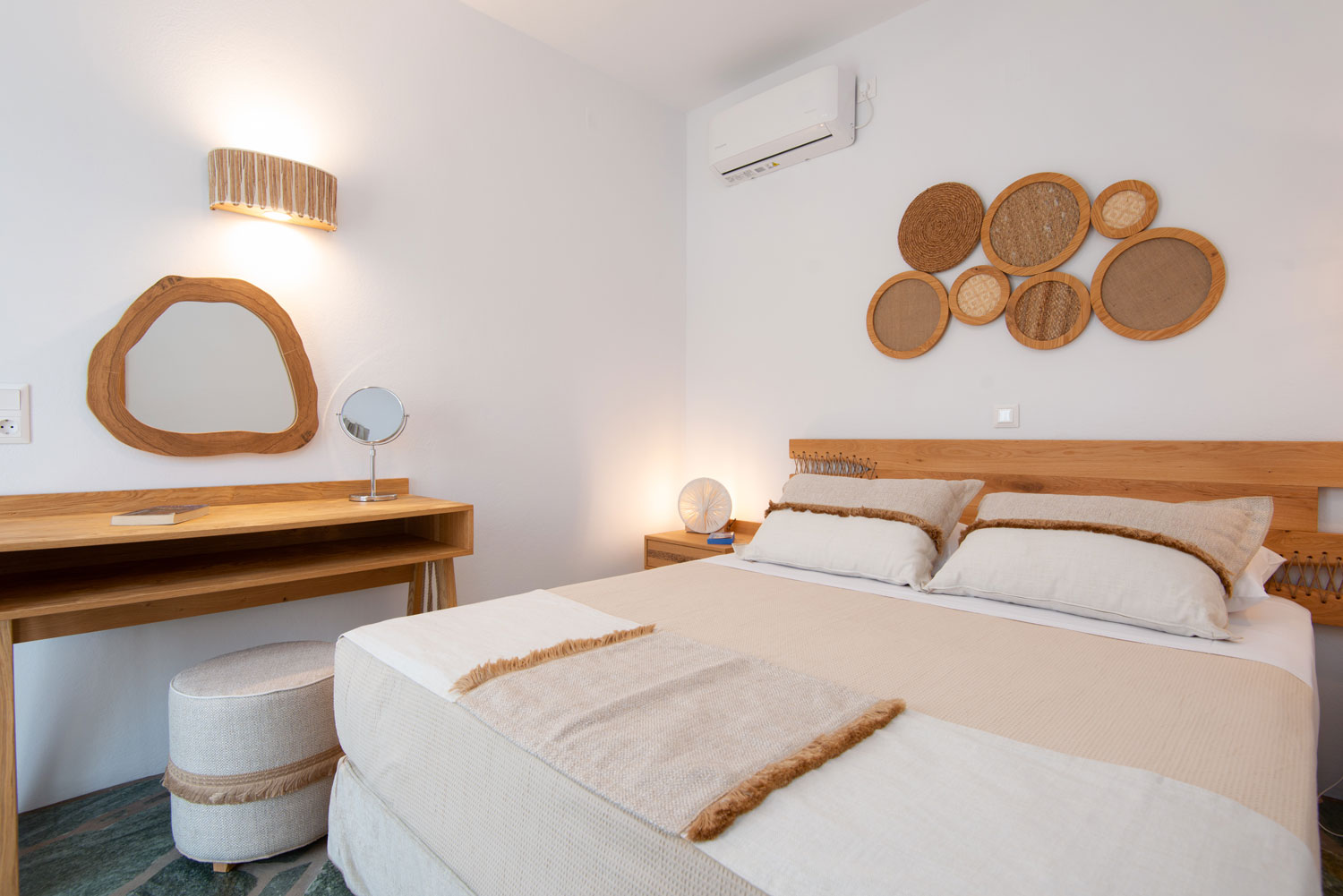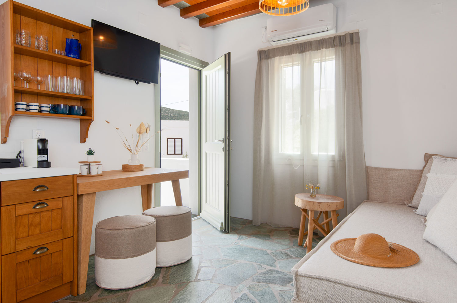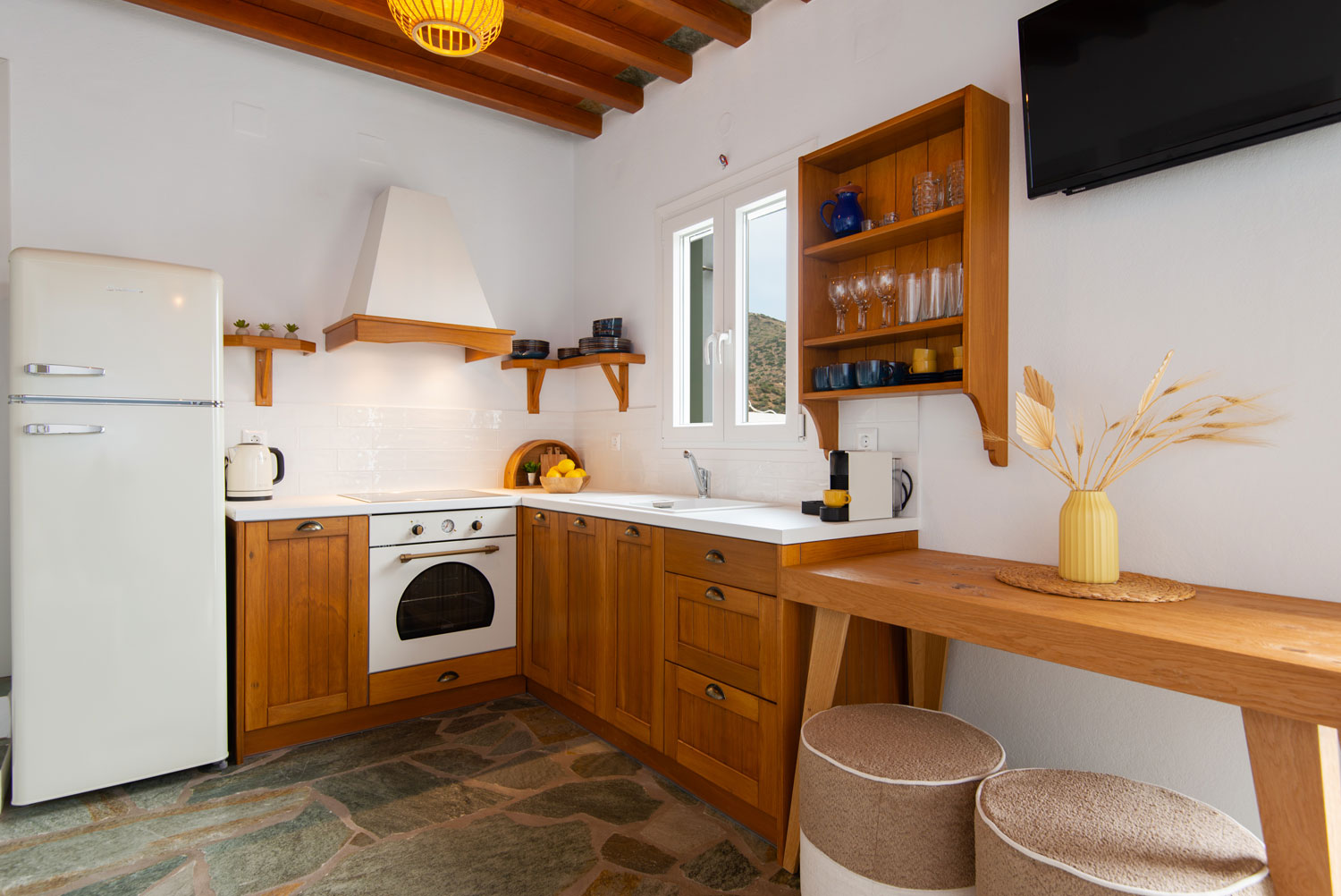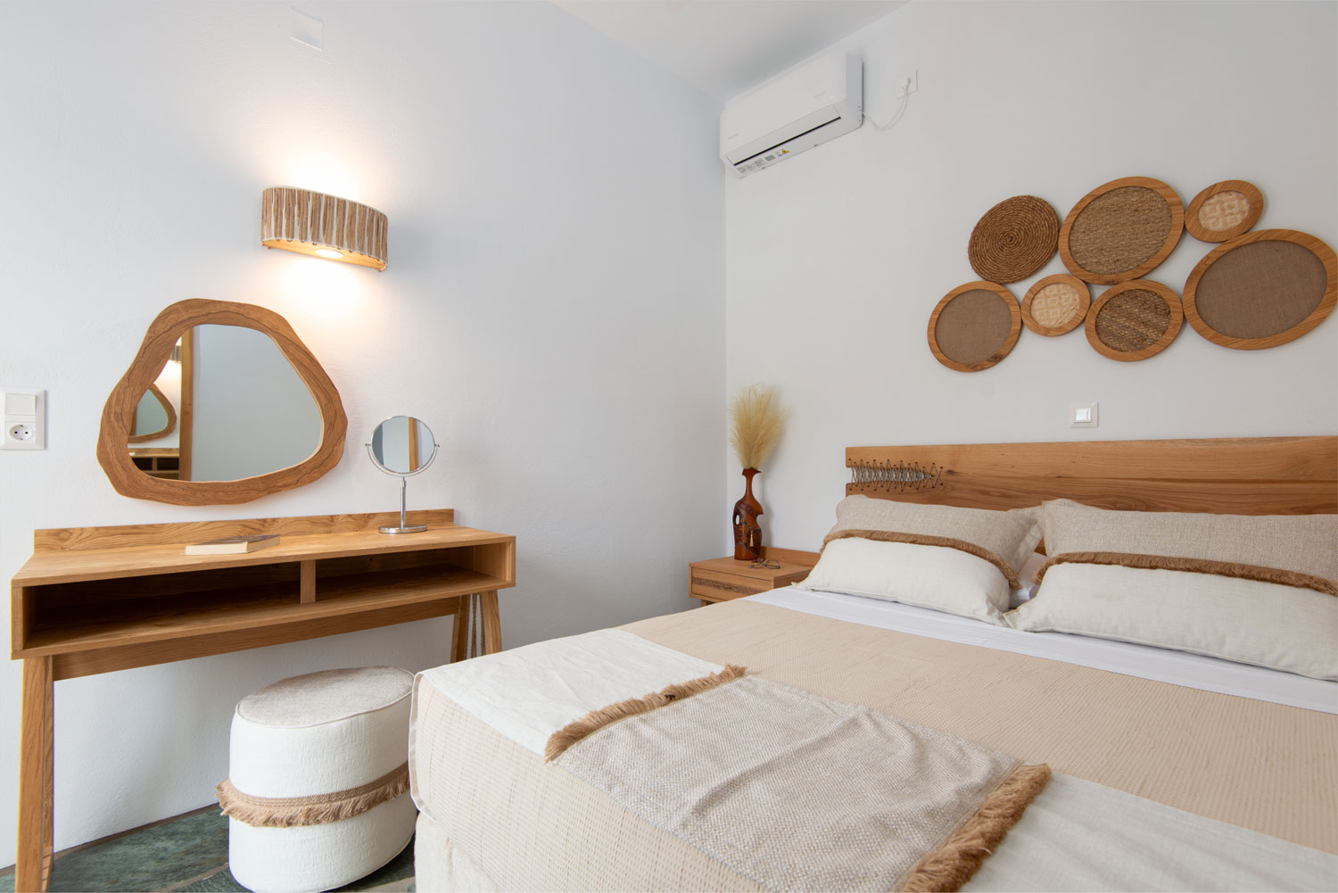 Οι ξύλινες λεπτομέρειες, τα πλακόστρωτα δάπεδα, τα παραδοσιακά ταβάνια με τα ξύλινα δοκάρια συνδυάζονται με απόλυτη αρμονία με τις σύγχρονες απαιτήσεις και ανάγκες στα τρίχωρα διαμερίσματα. Διαθέτουν δύο ευρύχωρα υπνοδωμάτια -το ένα με διπλό κρεβάτι και το άλλο με δύο μονά - τα οποία είναι εξοπλισμένα με κλιματισμό, ανεμιστήρα οροφής και τηλεόραση. Στον τρίτο χώρο βρίσκεται η μοντέρνα κουζίνα που είναι πλήρως εξοπλισμένη με όλες τις απαραίτητες συσκευές ώστε να μπορείτε να παρασκευάσετε τις λιχουδιές σας. Στο χώρο της κουζίνας βρίσκεται και το καθιστικό με τραπέζι φαγητούι. Στα μπάνια συνδυάζονται τα μοντέρνα είδη υγιεινής και τα ξύλινα στοιχεία.