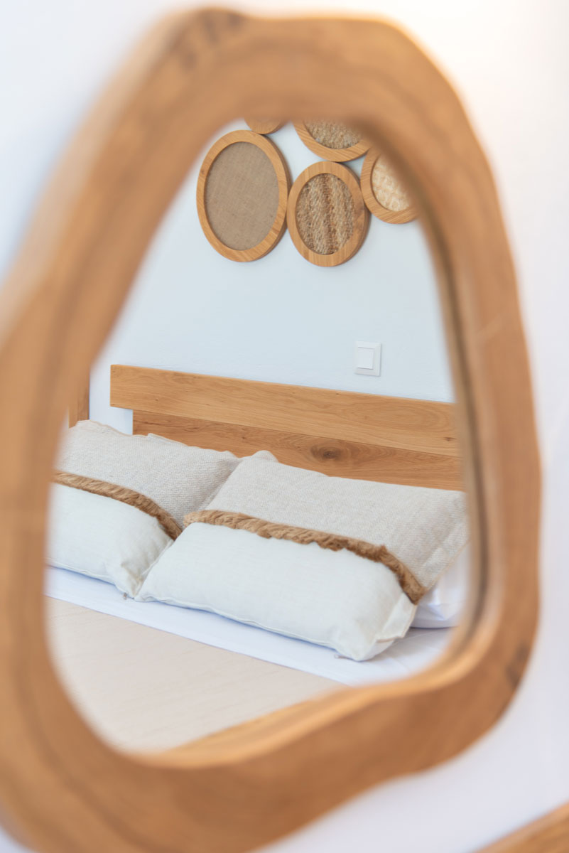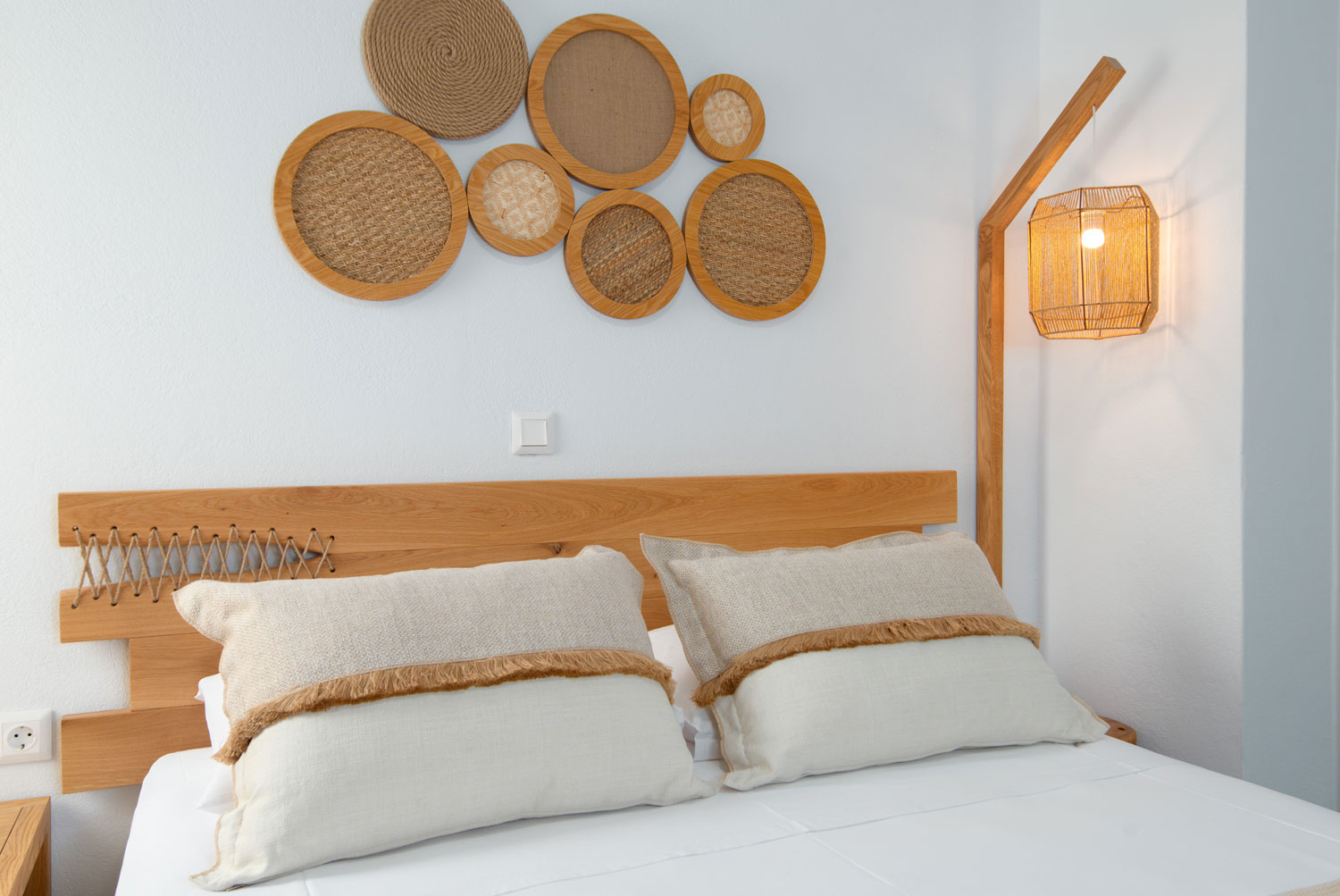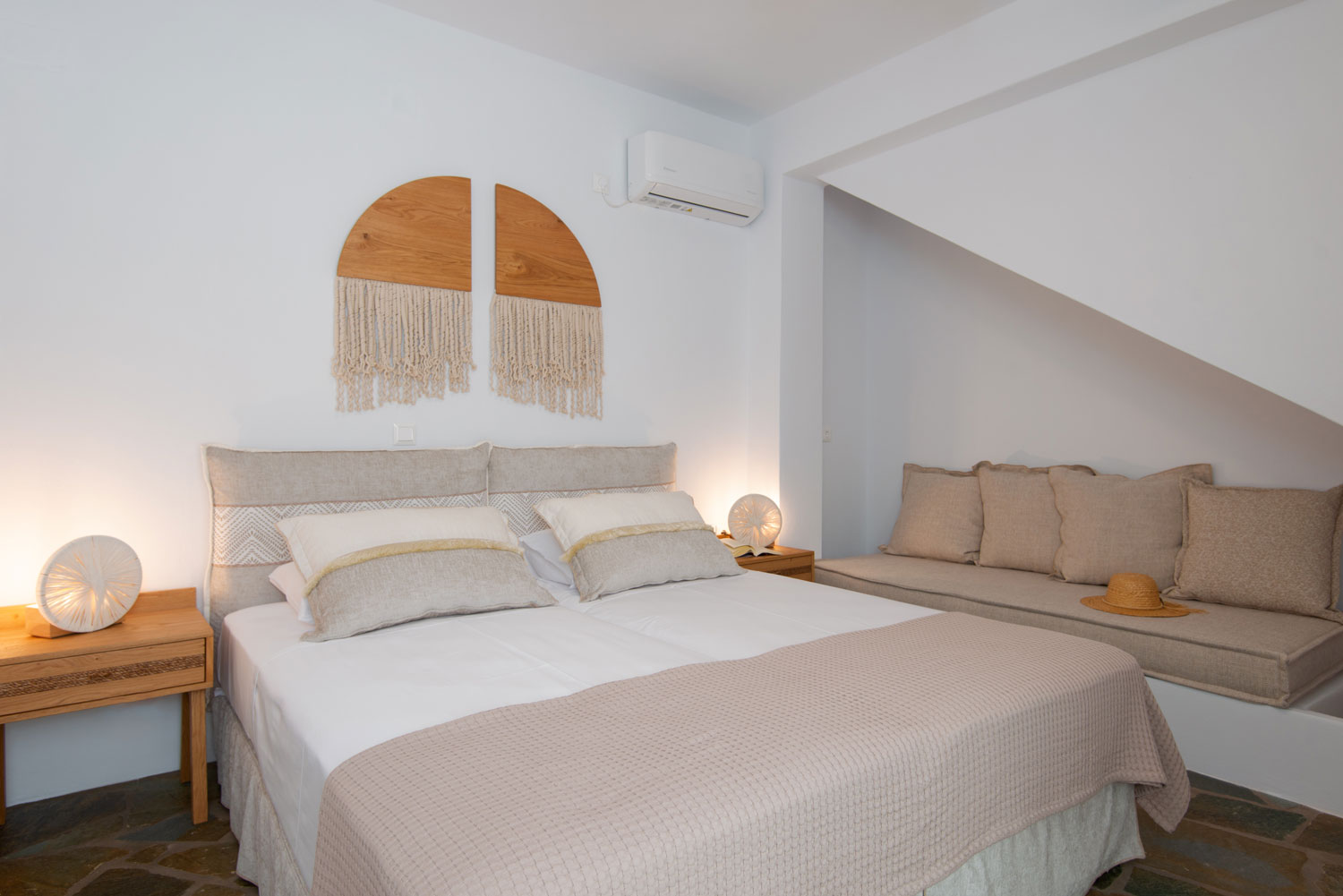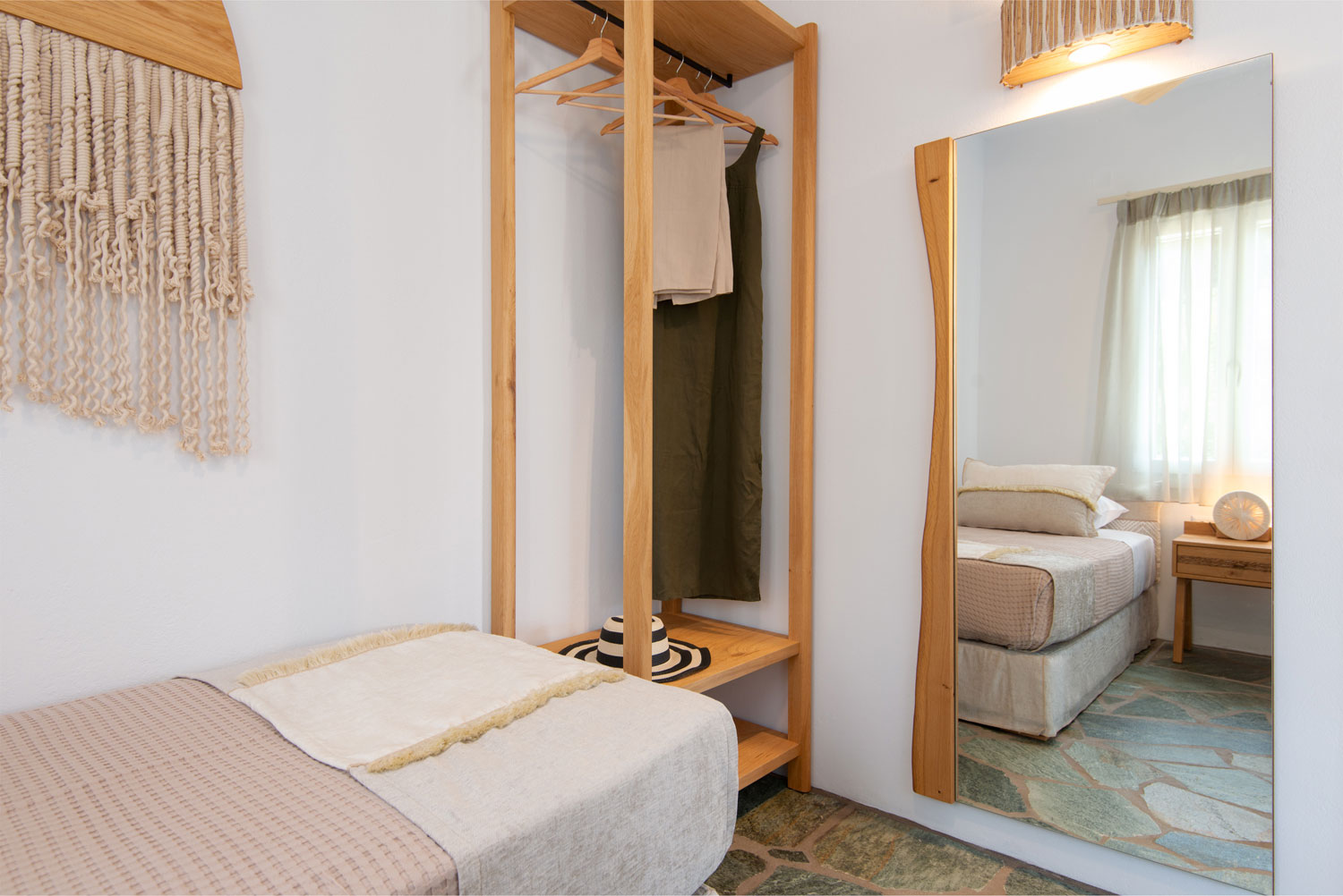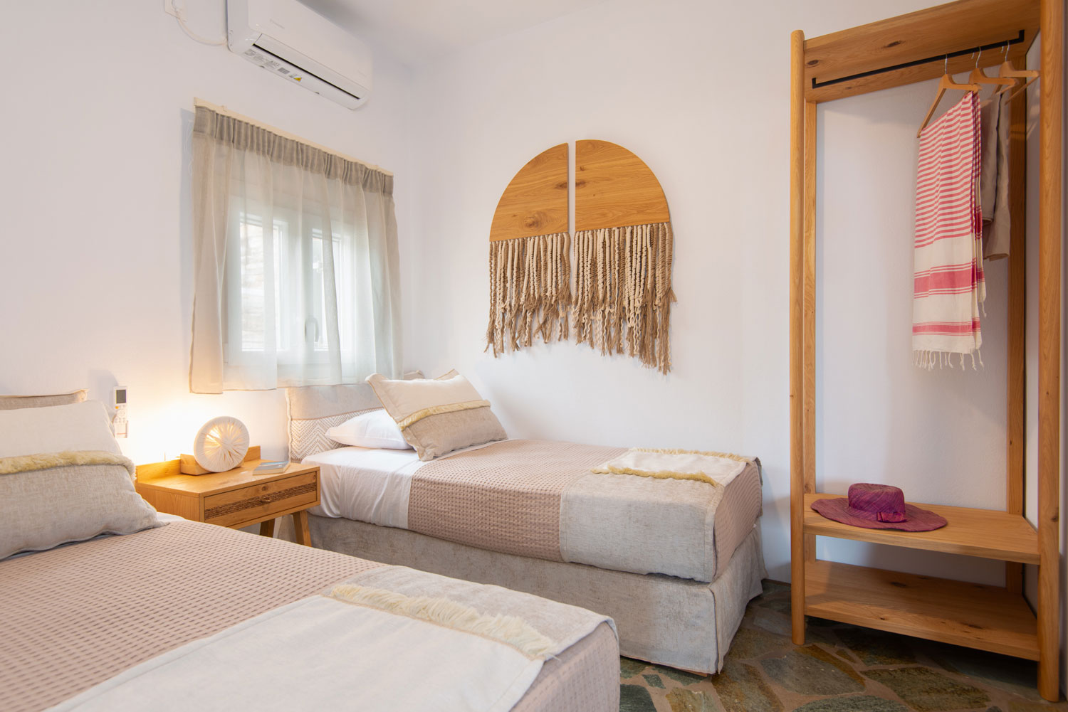 Οι ξύλινες λεπτομέρειες, τα πλακόστρωτα δάπεδα, τα παραδοσιακά ταβάνια με τα ξύλινα δοκάρια συνδυάζονται με απόλυτη αρμονία με τις σύγχρονες απαιτήσεις και ανάγκες στα τρίχωρα διαμερίσματα. Διαθέτουν δύο ευρύχωρα υπνοδωμάτια -το ένα με διπλό κρεβάτι και το άλλο με δύο μονά - τα οποία είναι εξοπλισμένα με κλιματισμό, ανεμιστήρα οροφής και τηλεόραση. Στον τρίτο χώρο βρίσκεται η μοντέρνα κουζίνα που είναι πλήρως εξοπλισμένη με όλες τις απαραίτητες συσκευές ώστε να μπορείτε να παρασκευάσετε τις λιχουδιές σας. Στο χώρο της κουζίνας βρίσκεται και το καθιστικό με τραπέζι φαγητούι. Στα μπάνια συνδυάζονται τα μοντέρνα είδη υγιεινής και τα ξύλινα στοιχεία.