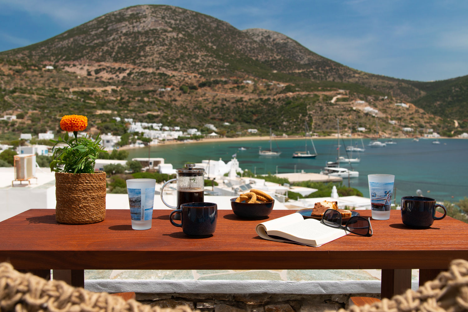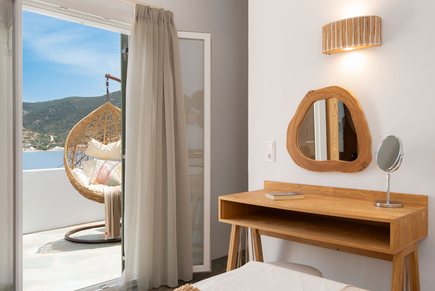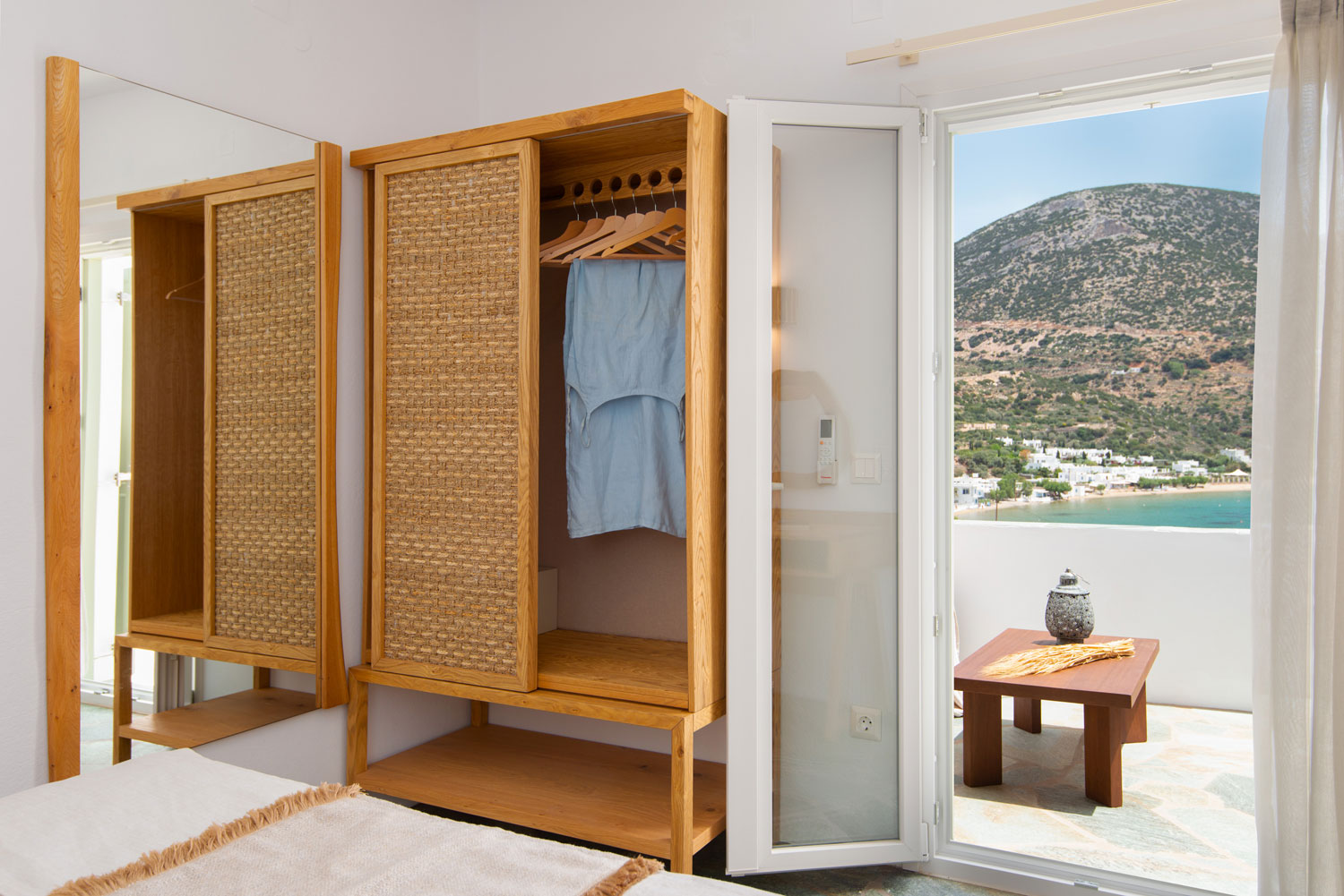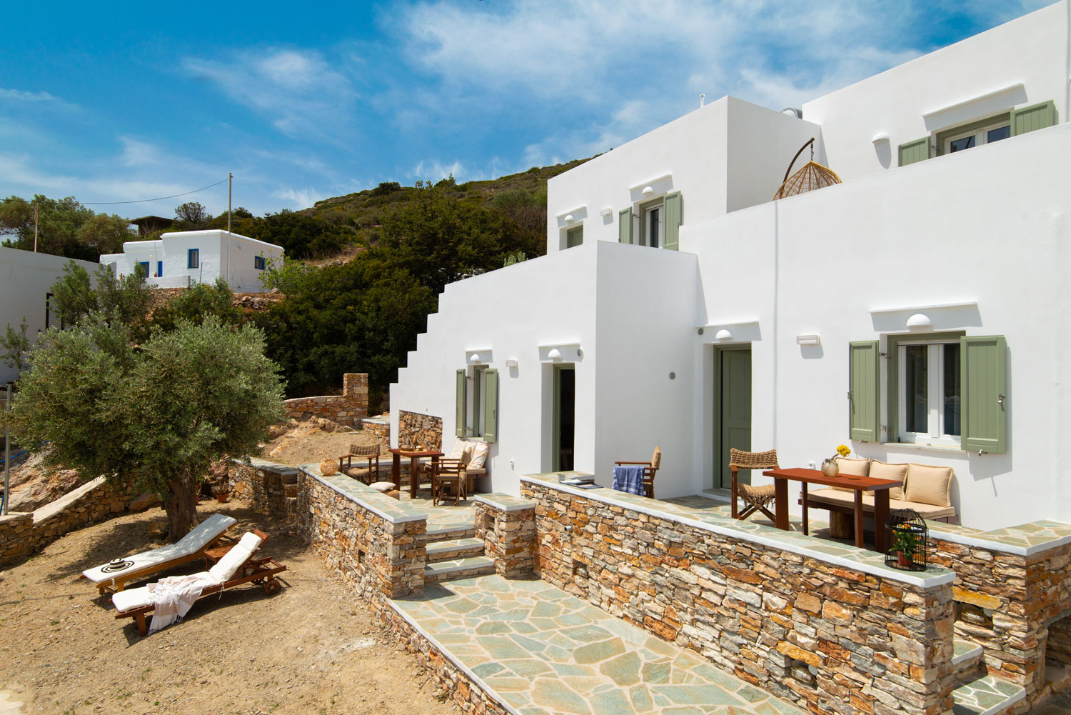 Όλα τα διαμερίσματα διαθέτουν πλακόστρωτες ιδιωτικές βεράντες με άνετα καθιστικά και απεριόριστη θέα στη θάλασσα και στον γραφικό κόλπο του Βαθιού.