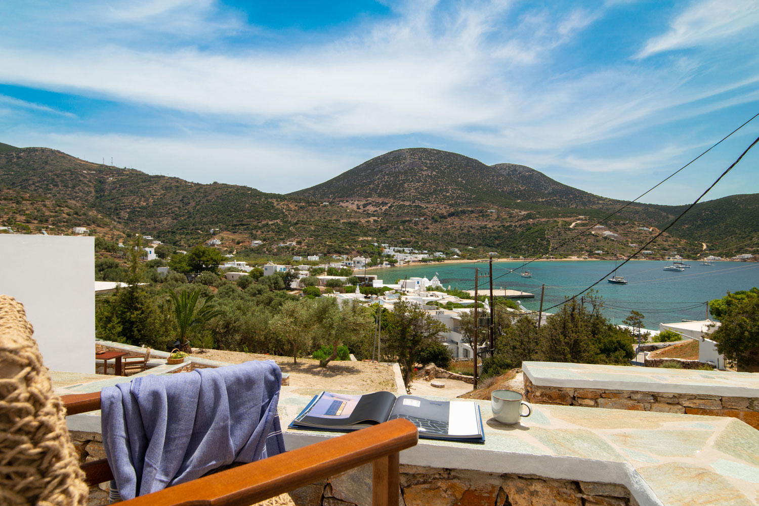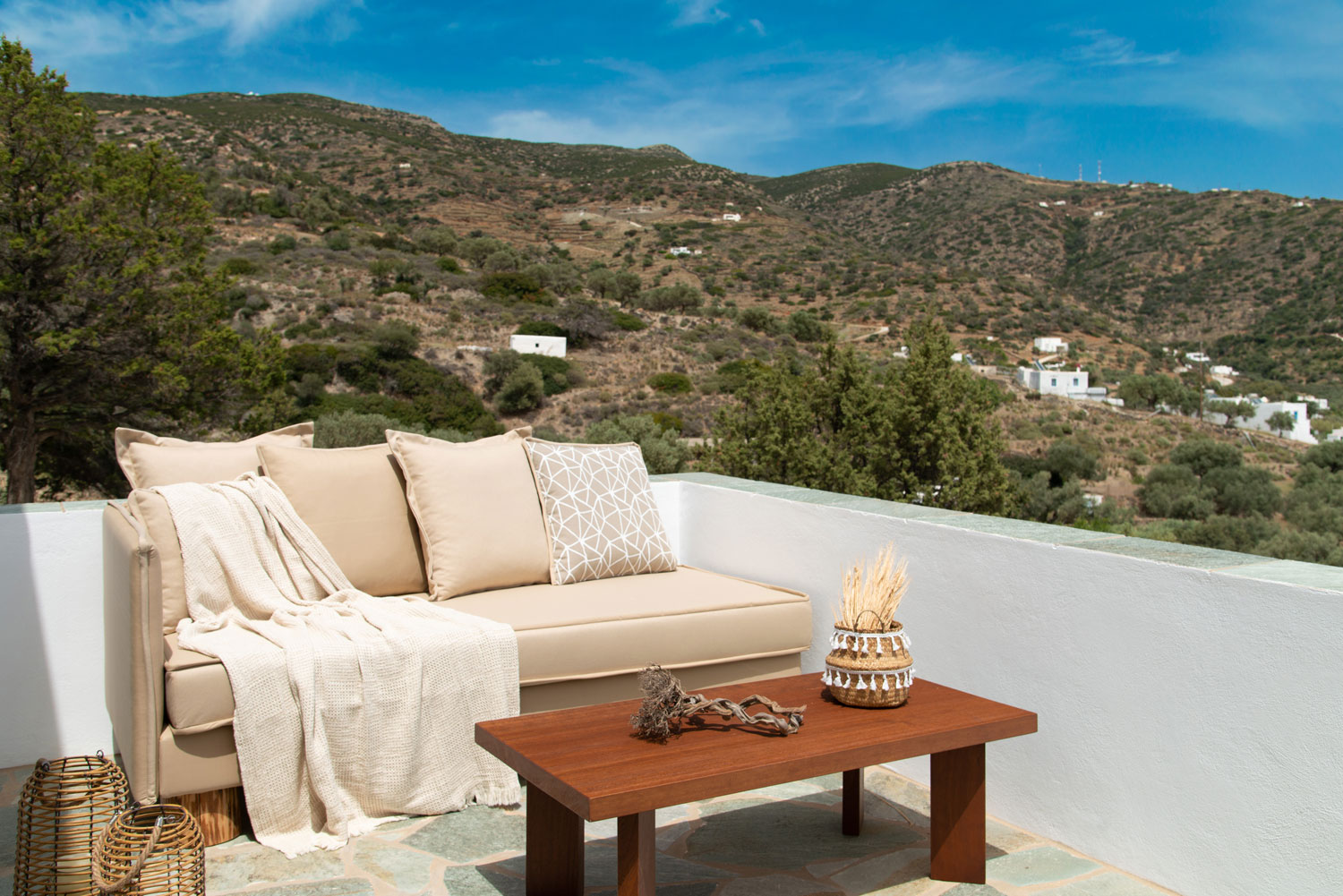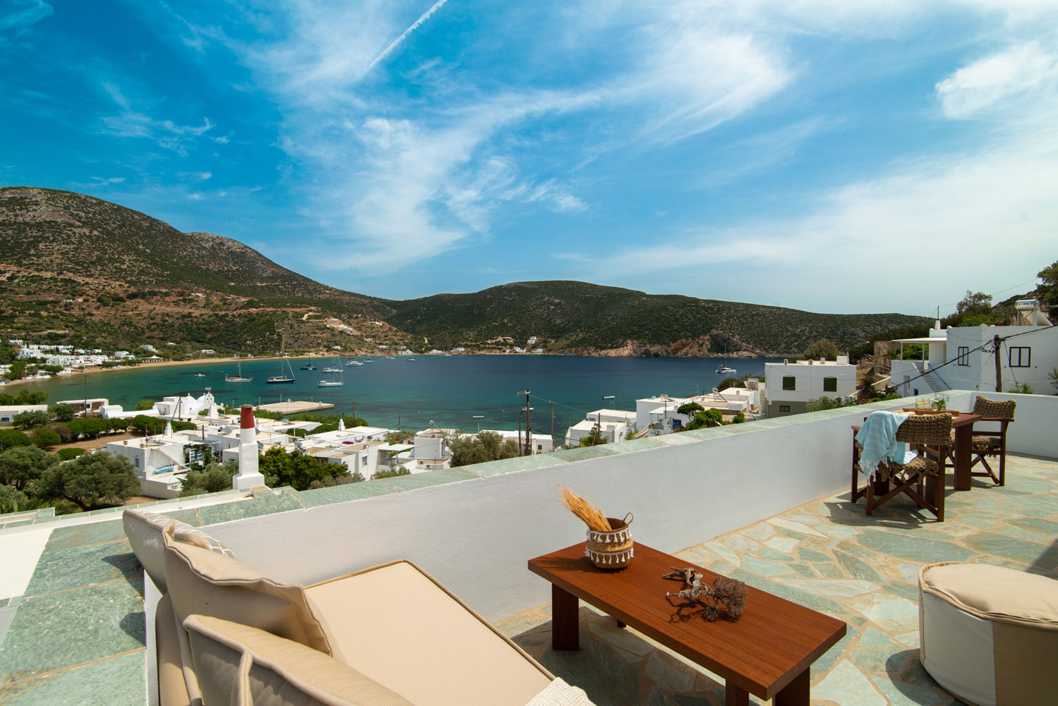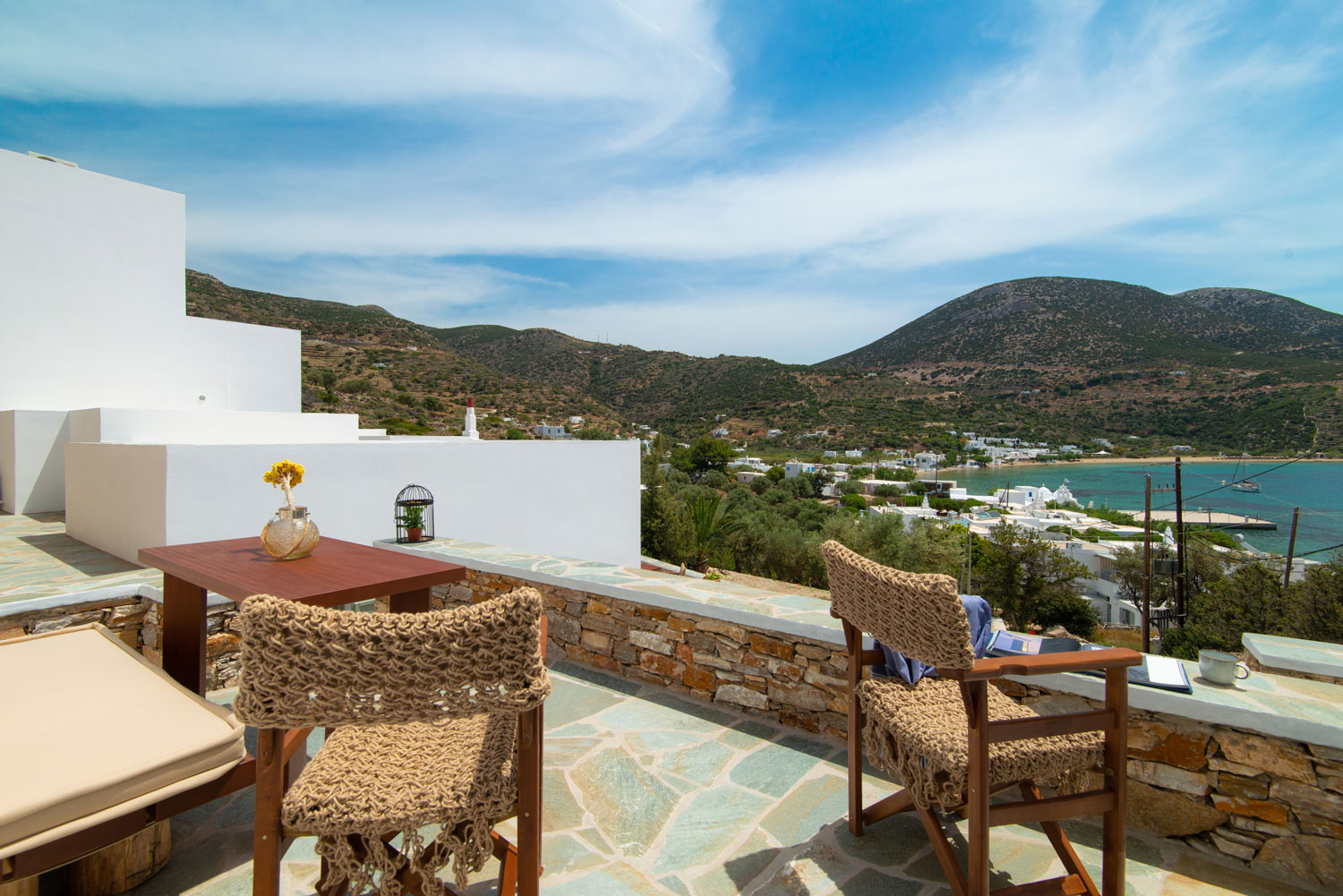 Όλα τα διαμερίσματα διαθέτουν πλακόστρωτες ιδιωτικές βεράντες με άνετα καθιστικά και απεριόριστη θέα στη θάλασσα, στον γραφικό κόλπο του Βαθιού αλλά και στο ηλιοβασίλεμα.