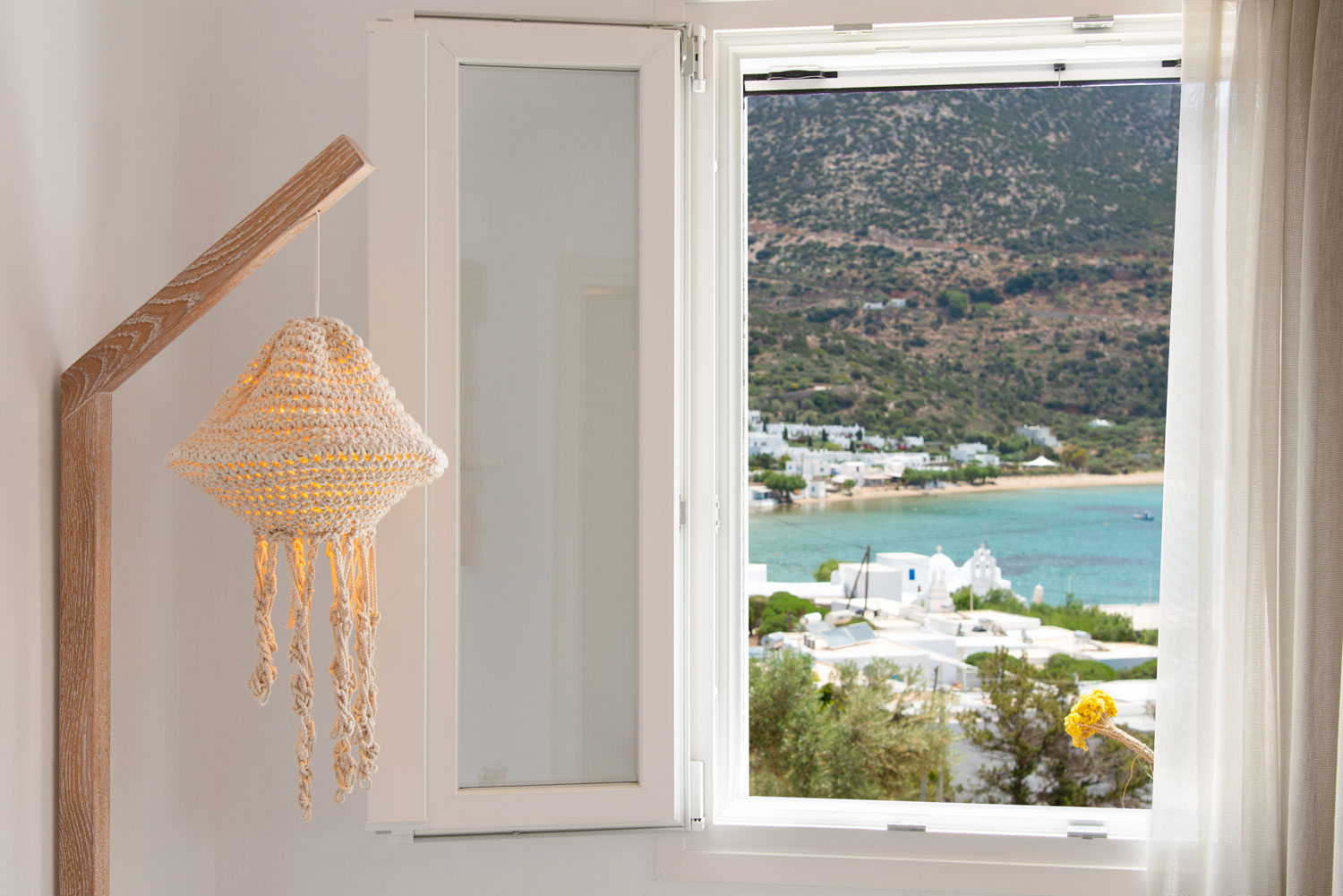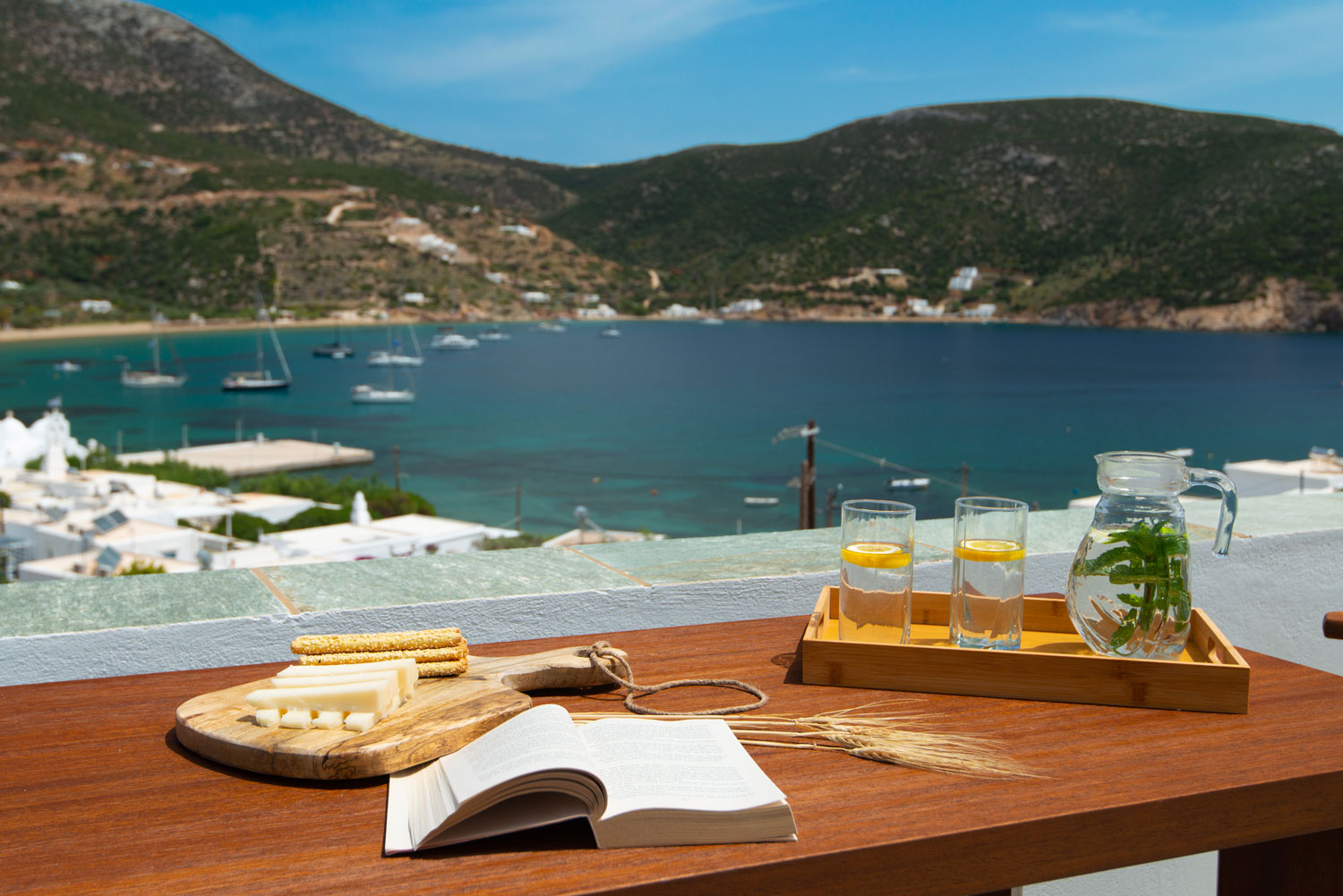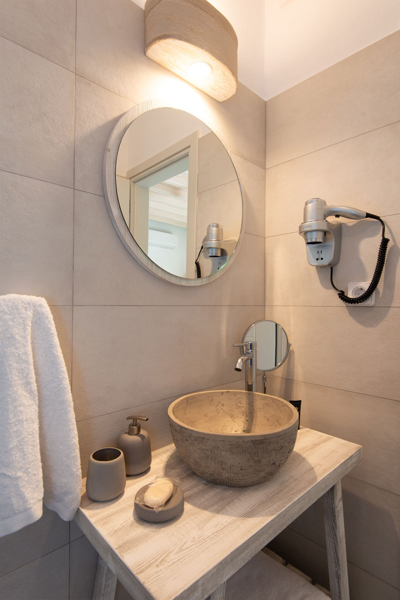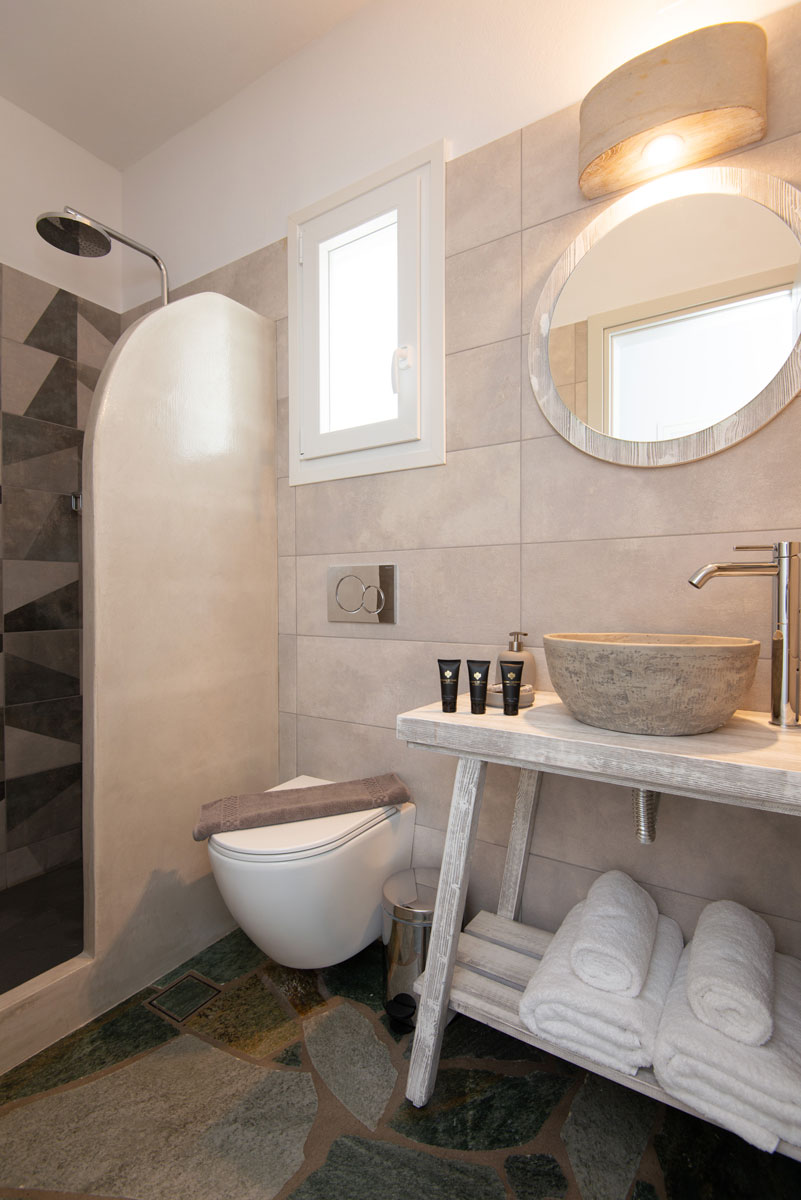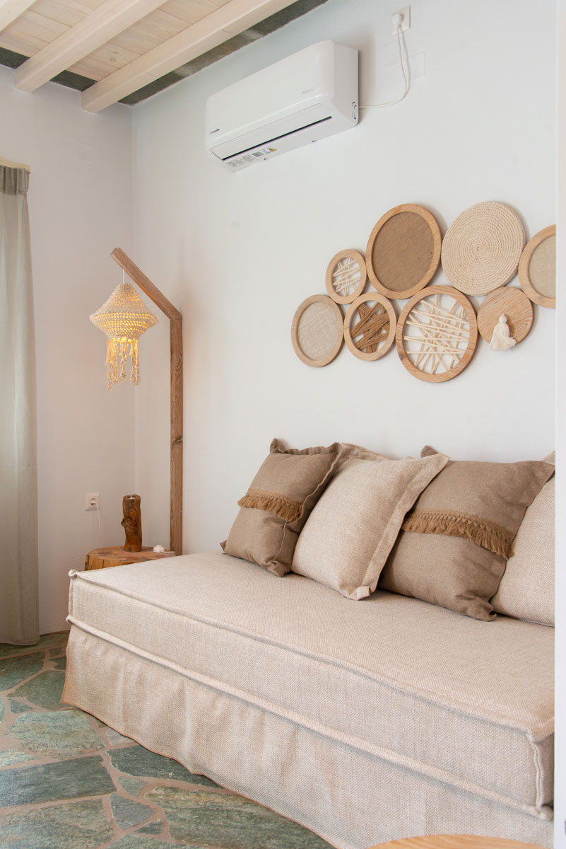 Όλα τα διαμερίσματα διαθέτουν πλακόστρωτες ιδιωτικές βεράντες με άνετα καθιστικά και απεριόριστη θέα στη θάλασσα, στον γραφικό κόλπο του Βαθιού αλλά και στο ηλιοβασίλεμα.