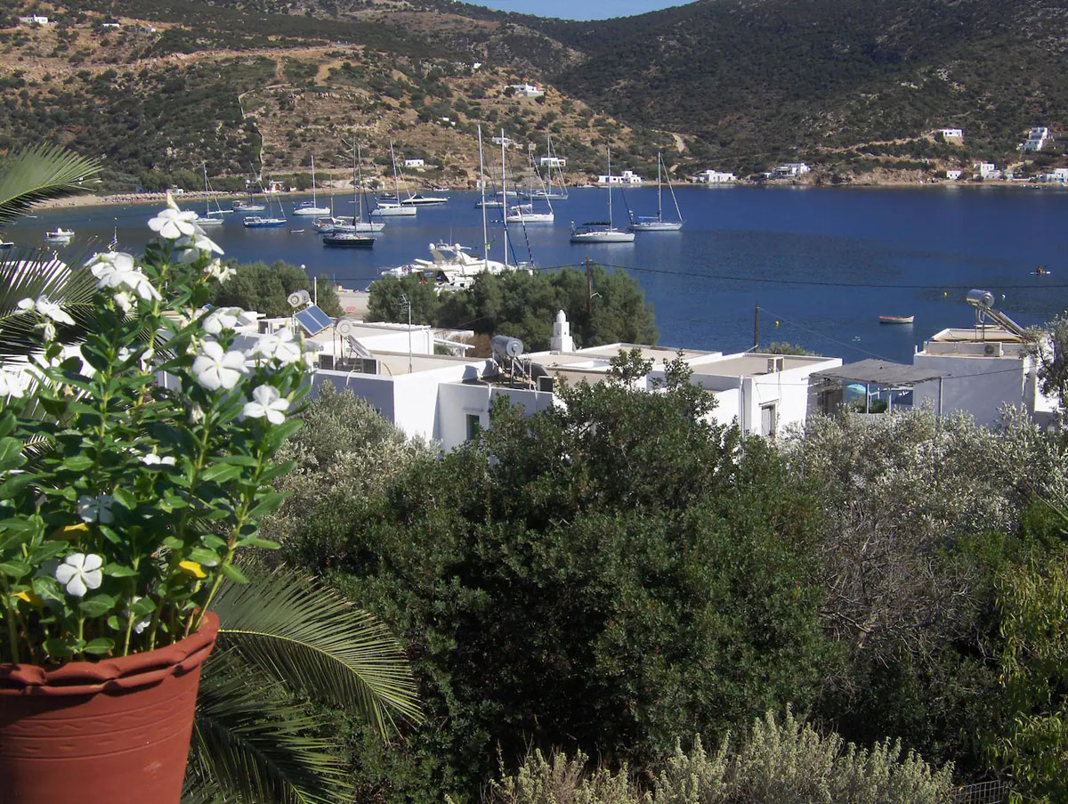 Περιμετρικά του σπιτιού υπάρχουν ευρύχωρες πλακόστρωτες αυλές με άνετα καθιστικά και σκιερές γωνίες από όπου μπορείτε να απολαύσετε τη θέα στον γραφικό κόλπο του Βαθιού.